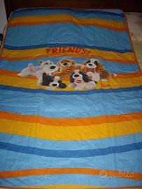 Vendo trapuntino x letto singolo 1 piazza della Trudi collezione " Friends " by Gabel. Double face, tinta unita sul retro e stampa sul davanti con sfondo giallo, arancio, azzurro e bluette.
