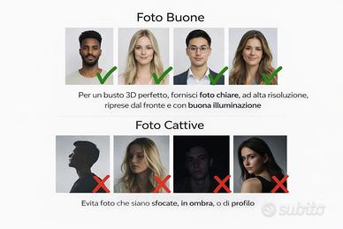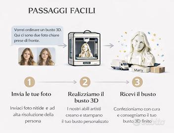🔥 TRASFORMA LA TUA FOTO IN UNA STATUETTA 3D PERSONALIZZATA 🔥 🧑🎨 BUSTO 3D REALISTICO – IDEA REGALO UNICA Vuoi qualcosa di davvero originale? Trasformo una tua semplice foto in una statuetta 3D mezzo busto personalizzata, realistica e curata nei minimi dettagli! 📸 Basta una foto frontale, nitida e ben illuminata 🖨️ Io mi occupo di tutto: modellazione + stampa 3D ✨ CARATTERISTICHE ✔️ Riproduzione fedele del volto ✔️ Effetto scultura elegante (stile marmo/bianco seta) ✔️ Personalizzazione nome sulla base (opzionale) ✔️ Ideale come regalo, ricordo o decorazione 📏 DIMENSIONI E PREZZI 💰 A partire da 14€ 📐 Altezza disponibile da 7 cm fino a 20 cm 7 cm → 14€ 10 cm → prezzo intermedio 15 cm → prezzo intermedio 20 cm → top qualità e dettagli massimo (Scrivimi per un preventivo preciso in base alla misura!) 🚀 COME FUNZIONA (SUPER SEMPLICE) 1️⃣ Inviami la tua foto (frontale e chiara) 2️⃣ Realizzo il modello 3D personalizzato 3️⃣ Stampo e spedisco il tuo busto 📦 Spedizione veloce e imballaggio sicuro 📸 CONSIGLI PER UN RISULTATO PERFETTO ✔️ Foto frontale ✔️ Alta qualità ✔️ Buona luce naturale ❌ No foto scure, sfocate o di profilo 🎁 PERFETTO PER: 🎂 Regali compleanni 💑 Coppie 👨👩👧 Famiglia 🐶 Anche animali domestici! 🎓 Ricordi speciali 💬 CONTATTAMI SUBITO! Rispondo velocemente 🔥 Mandami la tua foto e iniziamo! 📬 Spedizione Spedizione rapida e imballo accurato