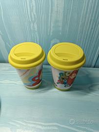 Travel mug - tazze da viaggio, resistenti con coperchio morbido. Nuove e mai utilizzate, presentano una grafica colorata ed un sottobicchiere in gomma staccabile. Tramite ricerca Google sembrerebbero essere marca Quy Cup, ma non lo posso garantire non essendoci scritto sopra al prodotto.