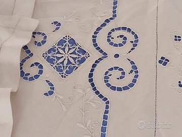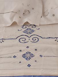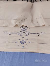 Antica traversa + copri federe ricamate a mano.Mai usate presentano piccoli segni del tempo.