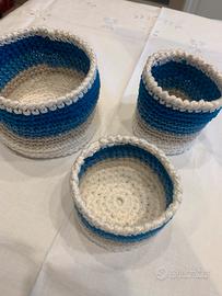 Tre cestini a uncinetto per porta trucchi o porta batuffoli o dischetti