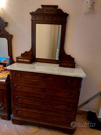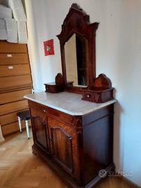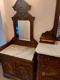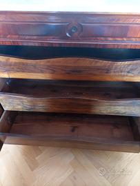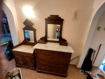 3 credenze antiche in legno massiccio e marmo, una più piccolina adatta a disimpegno con cassetto e sportelli, nanna un ombrellino del cassetti. Le altre 2 sono comò adatte a camera da letto o sala. Una con 5 cassetti di cui uno esterno e due sportelli con 4 interni e l'latra con 4 cassetti, manca il rivestimento di uno dei due piccoli cassettini superiori. . Vendibili anche singolarmente. ottimo stato