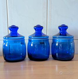 3 vasi blu in vetro, ideali per bagno o cucina, con coperchio con pomello. Diametro cm 9 e altezza cm 10. Molto belli ed eleganti, vintage, anni 1960, buonissime condizioni.