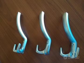 Vendo, causa inutilizzo, 3 ganci appendiabiti in metallo color argento, ciascuno con un gancio grande e due piccoli. Nuovi mai usati.