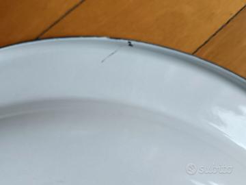 piatto marca Tre Leoni, classica dei piatti smaltati, cm 36,leggeri segni di usura al centro e due piccoli difetti di smaltatura nella parte inferiore, bordino blu