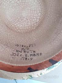 La Ceramiche Artistiche Gialletti Giulio S.n.c., fondata nel 1959 da Virgilio e Giulio Gialletti, ha da sempre impostato la propria produzione seguendo gli stili classici di Deruta( Perugia-Italia) e avvalendosi della collaborazione di valide maestranze, capaci di ridare vita alla tradizione derutese nel settore della maiolica artistica rinascimentale, senza mai tralasciare la ricerca di nuove forme e decori.TRE PEZZI : 1 piatto circonferenza 25 cm----1 piatto circonferenza 35 cm------1 zuppiera con manici alta 15 cm. larga 28 cm. Ottima condizione, vintage anni 70 .