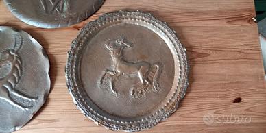 Vendo tre piatti in rame sbalzato per decorazione pareti. Raffigurano le tre figure dell'oroscopo Capricorno, Saggitario, Vergine. Diametri da 22 a 25 cm. Sul retro hanno i ganci per il posizionamento.