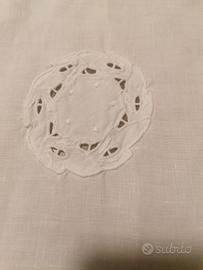 Tre tendine a vetro misure: alt, cm. 140 larghezza cm. 33 circa in lino. Lavorate a mano, al centro rosone ad intaglio, gli orli laterali son rifiniti con giurnino( orlo a giorno). Si presentano come nuove. N.b. Il prezzo è complessivo delle tre tendine.