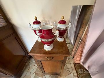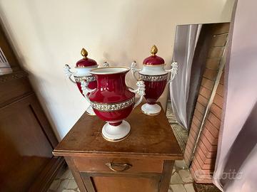 Vendo tre eleganti vasi/centrotavola decorativi in porcellana, caratterizzati da una raffinata colorazione bianca e rosso porpora, con dettagli dorati e manici lavorati che richiamano teste di animali.