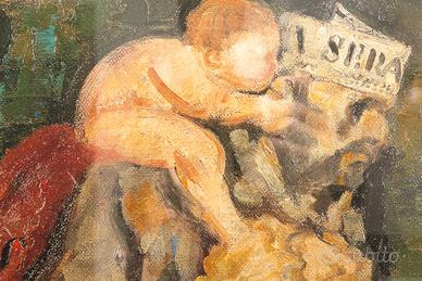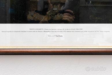 Questa riproduzione litografica, firmata dal celebre artista italiano Trento Longaretti, raffigura la scena struggente di un uomo povero che porta un bambino sulle spalle. L'opera, originariamente un olio su tela realizzato nel 1988/1989, riflette lo stile caratteristico di Longaretti, che fonde pennellate espressive con una tavolozza cupa per trasmettere temi di disagio e umanità. Si tratta di un'opera in edizione limitata, la numero 66 su 500, che la rende un pezzo unico da collezione. È incorniciato e pronto per essere esposto, aggiungendo profondità e approfondimento storico a qualsiasi spazio.