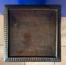Trespolo-Supporto per vasi o lampade-Tavolino a due piani, in legno scuro intagliato. Dimensioni: 32x32x63h Dimensioni appoggio in basso: 19x19x12h Il ripiano superiore è lievemente usurato dall’appoggio di un vaso.