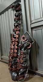 Ogni scultura è realizzata a mano con pezzi riciclati da auto e moto, rendendo ogni pezzo unico e irripetibile.