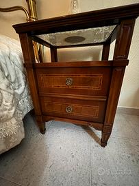 Trio como’ e due comodini Carpanelli In vero legno massello con decorazioni a intarsi Como composto da 2 cassettoni grandi e 2 cassetti Comodini composto da ripiano in vetro con vano a giorno e vano con antina Consegna a mano