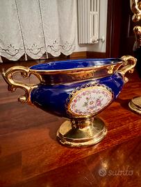 Il set è realizzato in porcellana blu cobalto con ricche finiture dorate e medaglioni floreali dipinti in stile Sèvres.