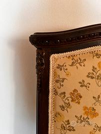 Design: Presenta uno schienale alto e gambe curve (cabriole), caratteristiche comuni nelle sedie d'epoca e in quelle in stile classico. La parte superiore dello schienale e le gambe mostrano intagli decorativi rifini con dettagli in ottone.