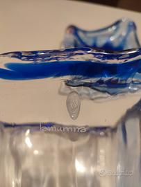 3)Svuotatasche in vetro Murano trasparente e blu, misure: altezza 5 cm, diametro lato più lungo 29 cm, diametro lato più corto 25 cm, con certificato di autenticità cartaceo e inserimento della firma " La Murrina" sul centrotavola