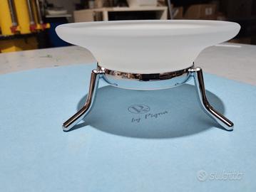 tripode supporto composto da una base metallica cromata a tre gambe e un piattino in vetro satinato.