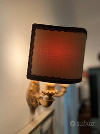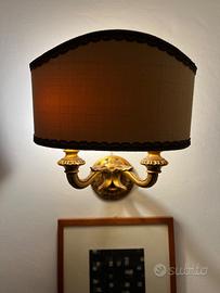 Tre applique vintage, perfettamente conservate e funzionanti. La base è decorata in color bronzo dorato, il paralume in tessuto di seta color écru con bordura in tinta (il colore più realistico è quello nella foto del dettaglio della base). Molto scenografiche, misura 32x37 profondità 30. Prezzo indicato per singola applique, per il tris a forfait 200