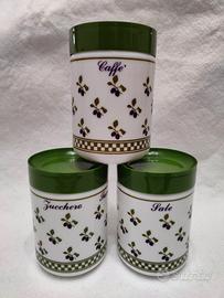 Tris di barattoli vintage per sale, zucchero e caffè.