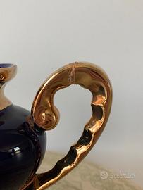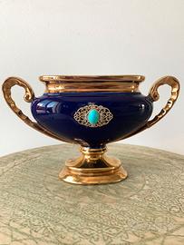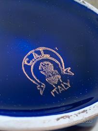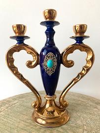 š¦ Spedizione con imballaggio rinforzato. Set decorativo da camino o credenza firmato C.A.L. Italy. Ceramica blu cobalto con finiture in oro zecchino e medaglione centrale in filigrana con castone turchese. Tutti i pezzi riportano il marchio originale e il numero di serie (299) sul fondo. ⢠Brand: C.A.L. Italy (Ceramiche Artistiche Lavorate). ⢠Epoca: vintage, anni '70/'80. ⢠Materiali: ceramica smaltata, finiture galvaniche oro/argento, pietre dure sintetiche. ⢠Dimensioni: candelabri 26x21 cm | alzatina 15x25 cm. ⢠Condizioni: l'alzatina presenta segni di restauro sui manici (visibili in foto). I candelabri presentano lievi segni del tempo sulla doratura. Prezzo ridotto proprio per tenere conto di questi difetti