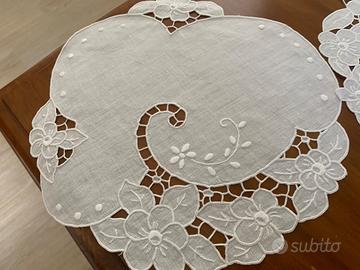 Preziosi tris di centri in lino bianco realizzati a mano a punto intaglio! Nuovi, mai usati né bagnati