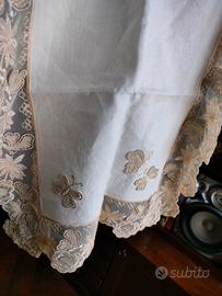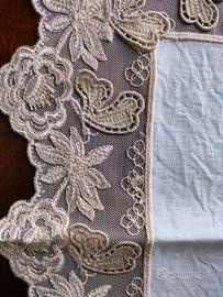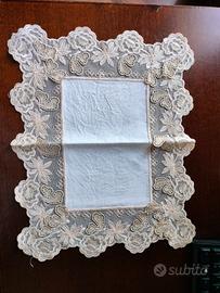Direttamente da baule del corredo, vendo questo raffinato trio di centrini da camera da letto composto da due centrini più piccoli da comodino e uno più grande da comó. Sono in puro lino finissimo color avorio con bordatura in pizzo macramè con motivo a fiori e farfalle a rilievo. Usato pochissimo, uno dei due piccoli mai usato, condizioni perfette, adatto per corredo a giovane ragazza dai gusti eleganti e giovanili. Nessun difetto, assolutamente perfetti.
