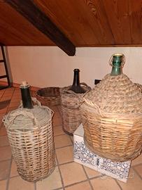 Tris di antichi bottiglioni della tradizione siciliana originali in vetro rivestiti da incannucciato con maniglie laterali da trasporto, ad uso arredamento ed esposizione in cantina o palmento d'epoca, ritrovati in antico locale produttivo etneo. Due similari più sfilati ed uno grande più basso. Si vendono insieme così come sono stati ritrovati.