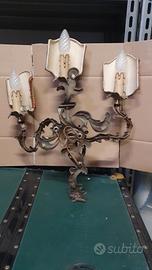 Tris di applique vintage tre luci. Designer elaborato e decorato con tre bracci che supportano lampadine e paralume di tessuto