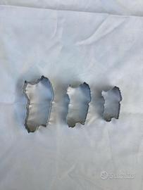 Tris di Formina taglia biscotti a forma di Sardegna, in acciaio, misure 1° cm.8,5 - 2° cm.7 - 3° cm.5,5. Nuove in confezione