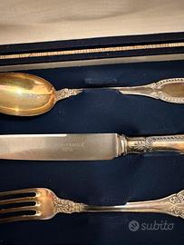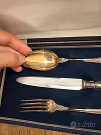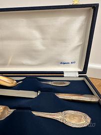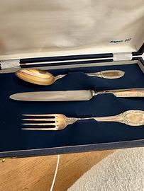 Servizio di tre posate fine anni '50 in argento 800 e lamina inox del coltello. Artigianato che veniva solitamente utilizzato come regalo di battesimo. Cofanetto originale. Da pulire