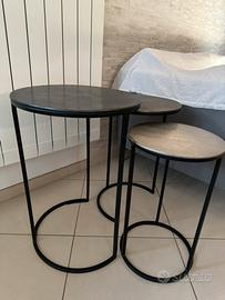Tris di tavolini da salotto con base in acciaio nero e i piani tondi uno dorato uno bronzo e uno brunito di Cargo-Milano. Sono versatili si possono spostare secondo le esigenze. Buono stato.