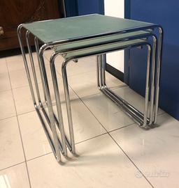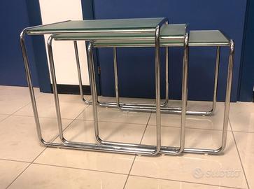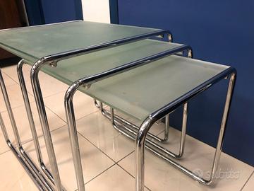 Trittico di tavolini a sovrapposizione realizzati con struttura solida e stabile in tubolare metallico cromato diametro 15mm e con piano di appoggio in vetro satinato spessore 6mm. Condizioni generali molto buone benché usati, ben conservati e privi di particolari difetti. Ciascun tavolino è indipendente dagli altri due ma presentano dimensioni tali da essere perfettamente sovrapponibili per un ingombro ridotto se necessario; ogni tavolino è dotato di 4 piedini d'appoggio in gomma e di 4 ventose per vincolo del piano in vetro. Ingombri come segue: