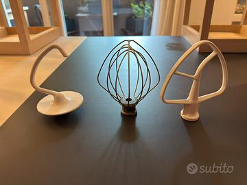 Vendo set di accessori originali KitchenAid composto da frusta, foglia e gancio. Gli articoli sono usati ma in buone condizioni, come visibile nelle foto allegate. Perfetti per chi desidera completare o sostituire i propri accessori KitchenAid senza rinunciare alla qualità.