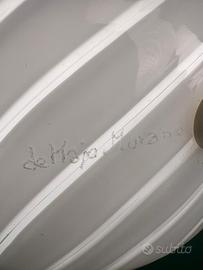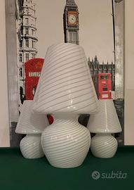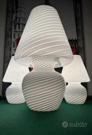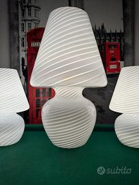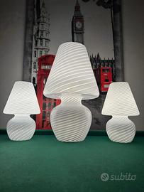 Tris di lampade da tavola molto belle del grande designer De Majo incisione sul vetro dí murano De Majo e noto per i suoi design sempre di murano sono originali tris completo e introvau Hanno una eleganza e line pulite senza tempo di grande impatto molto belli sia da spenti che accessi danno un tocco incredibile molto belli . Misure: Lampada grande: altezza 53 diametro 31 circa. Le due piccole ; altezza 31 diametro 19