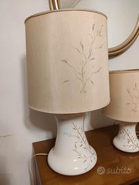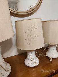 Splendido set di 3 lampade da tavolo coordinate, in ceramica bianca con delicati decori floreali e paralumi in tessuto color crema. Perfette per camera da letto (comodini + comò) o salotto. Il set è composto da: 1 Lampada Grande: Altezza 61 cm, Diametro paralume 31 cm. 2 Lampade Piccole: Altezza 42 cm, Diametro paralume 22 cm. Stato: Ottime condizioni estetiche, ceramiche integre senza sbeccature. Impianto elettrico funzionante. I paralumi sono originali e ben tenuti. Ritiro a mano a Roma, zona Cipro