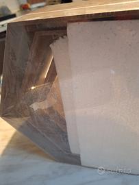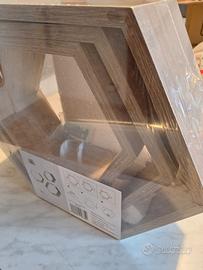 tris di mensole esagonali in legno di rovere, ancora imballate. Misure nella foto