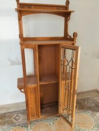 Il mobile centrale presenta una porta con vetro artistico piombato, ripiani interni e dettagli intagliati tipici del periodo Liberty primi ‘900.