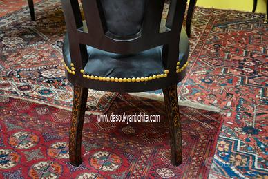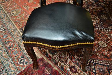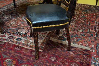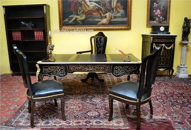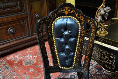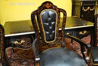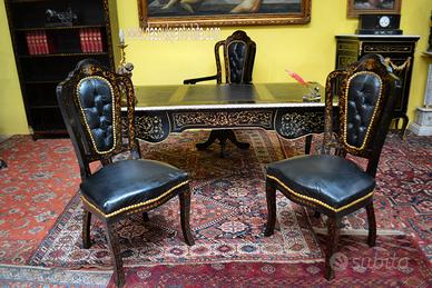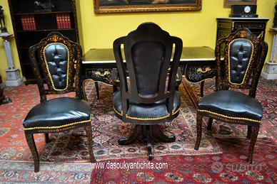 Elegante gruppo di tre poltrone da studio di cui una girevole in stile Napoleone III , legno ebanizzato dipinti in policromia a motivi floreali di gusto Boulle, caratterizzate da rivestimenti in pelle nera con bottoni trapuntati .