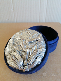 Vendo 2 vasetti, un porta candela in vetro blu con applicazioni argentate e scatolina. Il vasetto a righe verticali è alto cm 11, quello con tappo compreso è alto cm 14, mentre il porta candela ( diametro candela cm 2 ) è alto cm 23. Il portagioie invece di diametro fa cm 9 x cm 6 di altezza. Solo consegna a mano.