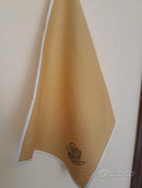 Vendo tris di strofinacci in damina di puro cotone color oro. Dim. cm.50x70 rifiniti con sbieco di puro cotone color panna e ricamati a macchina in vari colori.