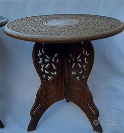 Tris di tavolini rotondi pieghevoli in legno massello originali dell'epoca nni '60. Piani incisi a motivi floreali, due con intarsi centrali in ottone. Gambe intagliate richiudibili, rinforzi a Y sul retro dei piani. Produzione indo-kashmir/Hoshiarpur, XX secolo.