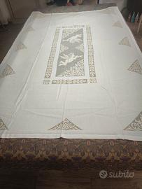 Vendo tris antico composto da coperta,lenzuolo e tovaglia purtroppo sprovvista di tovaglioli. Mai stato utilizzato,in puro lino colore écru con ampia lavorazione sfilato siciliano. Piccole macchie dovute alla conservazione,ma che lavando spariscono. Misure tovaglia 285×175 Misure coperta 285×270 Misure lenzuolo 285×270 €500