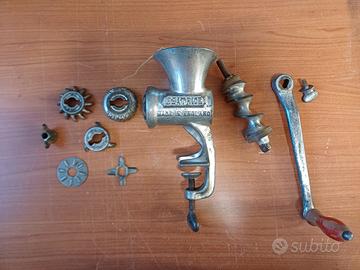 Vendo come da foto tritacarne manuale completo di diverse lame, funzionante, da pulire per l'effettivo utilizzo con alimenti.