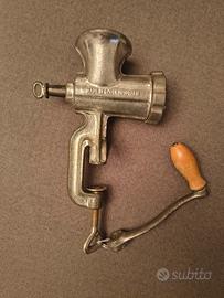 Tritacarne manuale Porket, misura 5 che è quella più domestica. Nasce per la carne, ma si usa anche per verdure o pane. In vendita per l'utilizzo con la sua funzione originale o come oggetto di arredamento vintage. Raro e molto robusto.