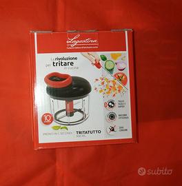Il tritatutto Lagostina è lo strumento indispensabile per la tua cucina, in grado di tagliare, sminuzzare, tritare in soli 5 secondi. Grazie alle sue due lame indipendenti ed alla paletta raccogli cibo inferiore, sarà possibile preparare triti di verdure, basi per soffritto, pomodori per le bruschette, sughi e salse di ogni genere, sempre perfette ed omogenee. La base antiscivolo garantisce una presa sicura, ed inoltre non necessita di corrente elettrica perchè attivato manualmente. E' facile da pulire perchè completamente smontabile.