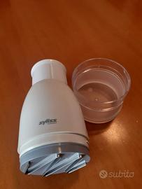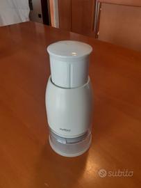 pratico trituratore svizzero a stantuffo con rotazione automatica e pulizia a sciacquo, con contenitore ermetico. Come nuovo.