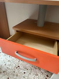 Scrivania con cassettiera - legno chiaro e arancio Comodino con cassetto - legno chiaro e blu Angoliera con scaffali blu