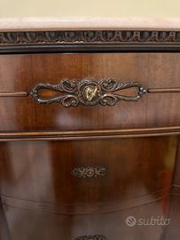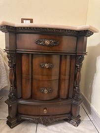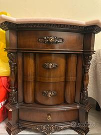 coppia di comodini e un comò abbinato in stile classico (probabilmente fine anni '80 / anni '90), con piano in marmo Rosa Portogallo e struttura in legno impiallacciato con elementi torniti e intagli decorativi.