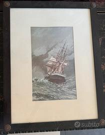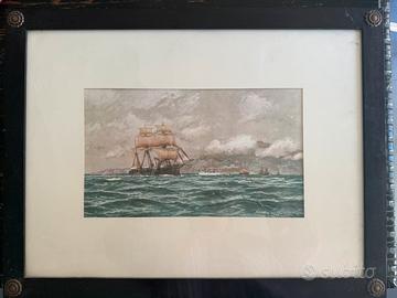 In vendita splendido set coordinato di tre stampe d’epoca raffiguranti scene di vita e manovre della Real Marina. Le opere portano la firma di Edoardo De Martino (1838–1912), il più celebre pittore di marina italiano, noto per essere stato l'artista ufficiale della Famiglia Reale inglese (Queen Victoria). Le immagini catturano con incredibile maestria tecnica e atmosfera romantica la forza del mare e la maestosità dei velieri, rendendole pezzi di grande fascino storico. Dettagli delle Opere: • Soggetti: Due vedute verticali di velieri in navigazione e una veduta orizzontale di un convoglio navale presso la costa. • Cornici: Cornici originali dell'epoca in legno scuro, caratterizzate da una lavorazione a sbalzo lungo i bordi e impreziosite da borchie angolari in metallo lavorato con motivo floreale. • Stato: Ottime condizioni vintage. La naturale patina del tempo sul legno e sulla carta ne autentica l'epoca e ne accresce il valore estetico.