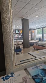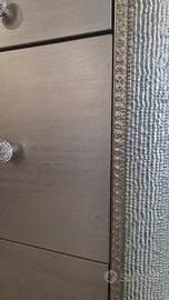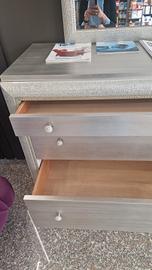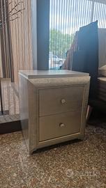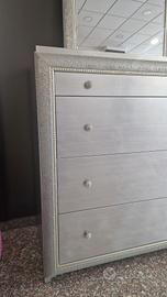Vendo trittico composto da comò, due comodini e la specchiera in finitura foglia argento con pomelli in cristallo. Il prodotto è da esposizione e presenza delle lievi imperfezioni.